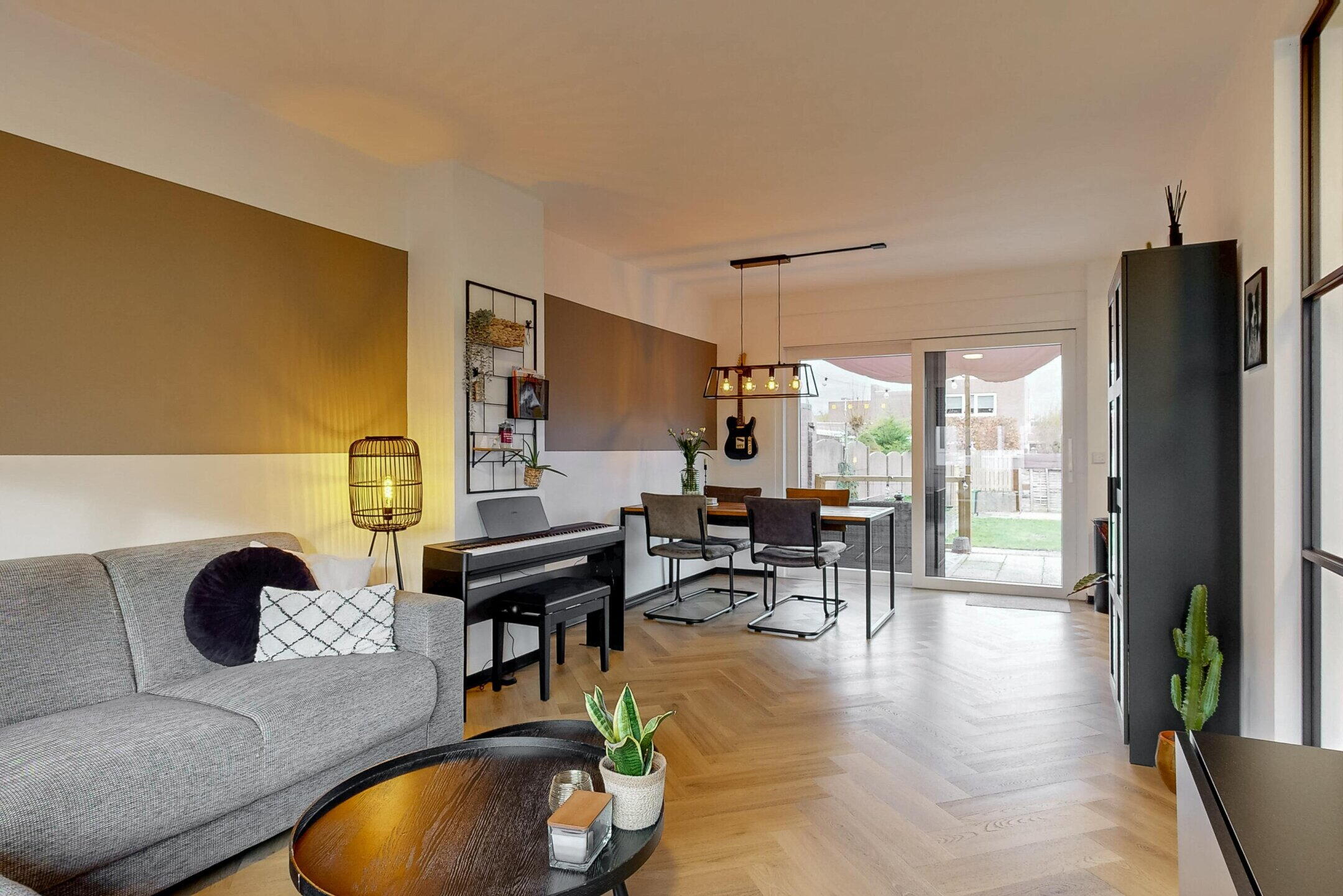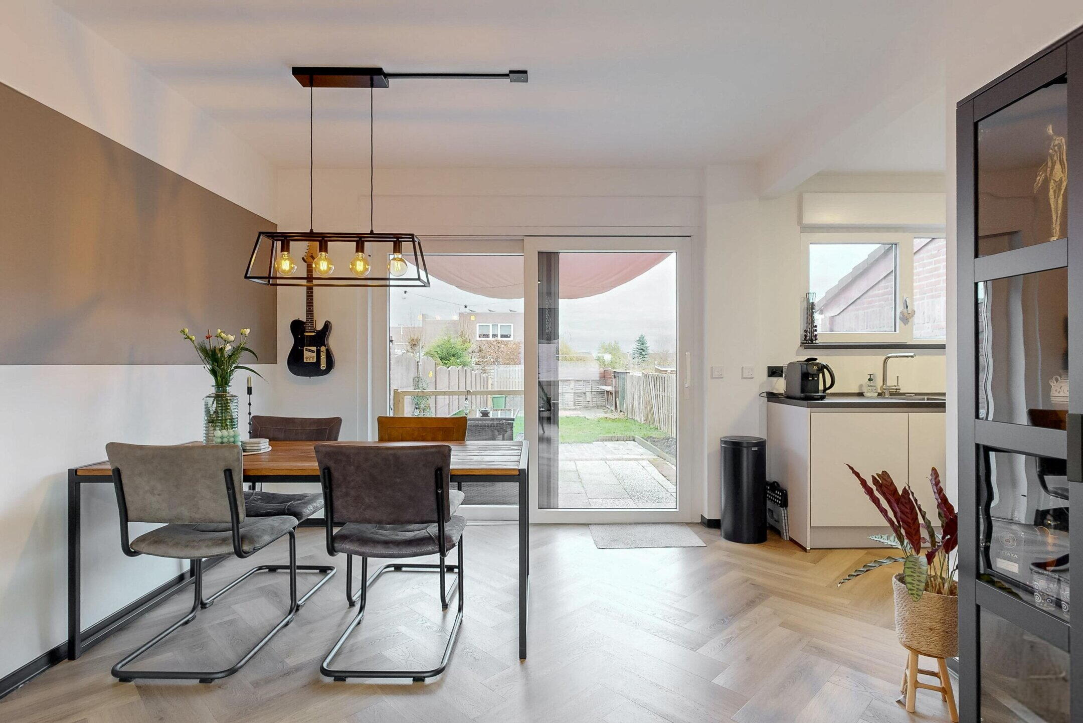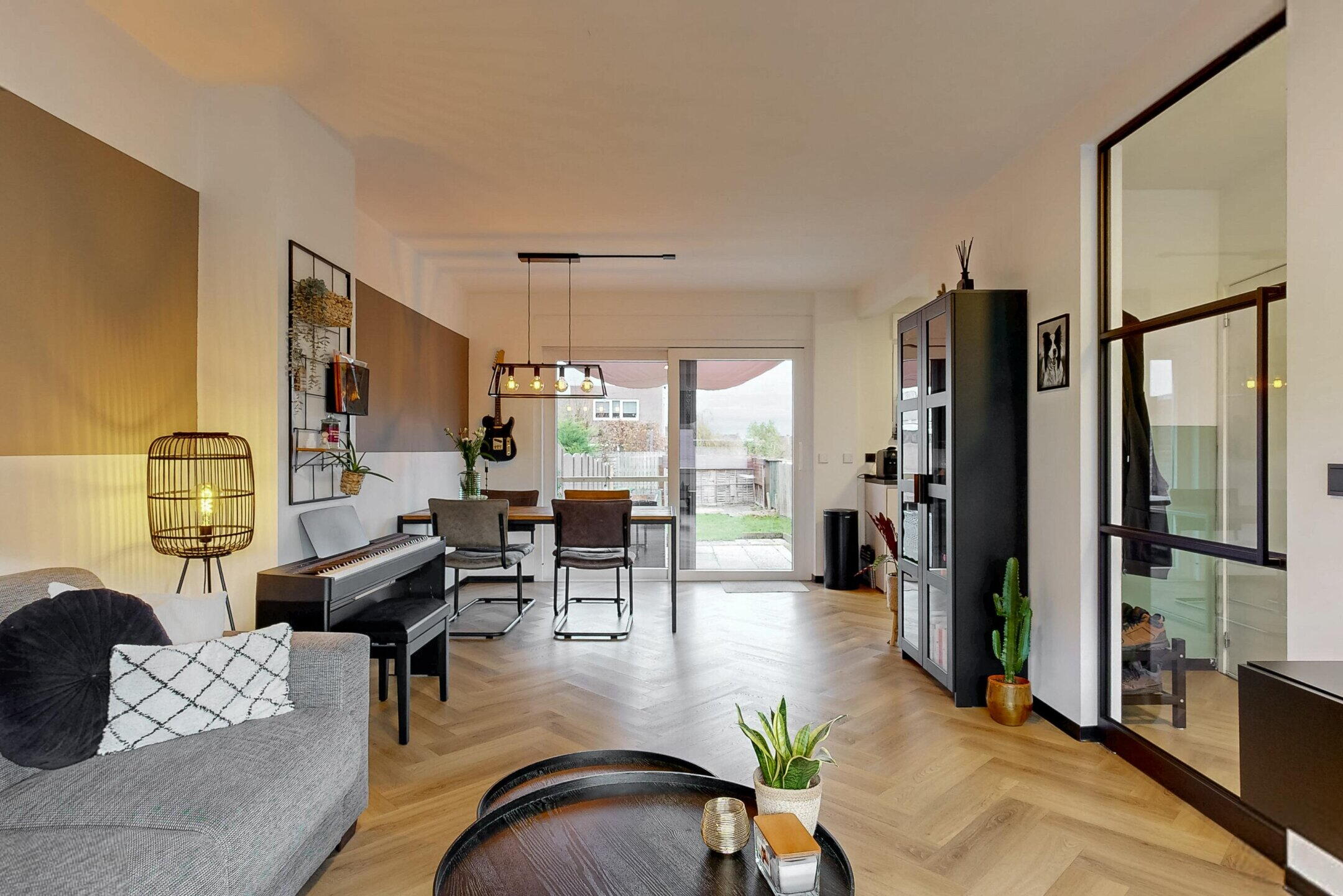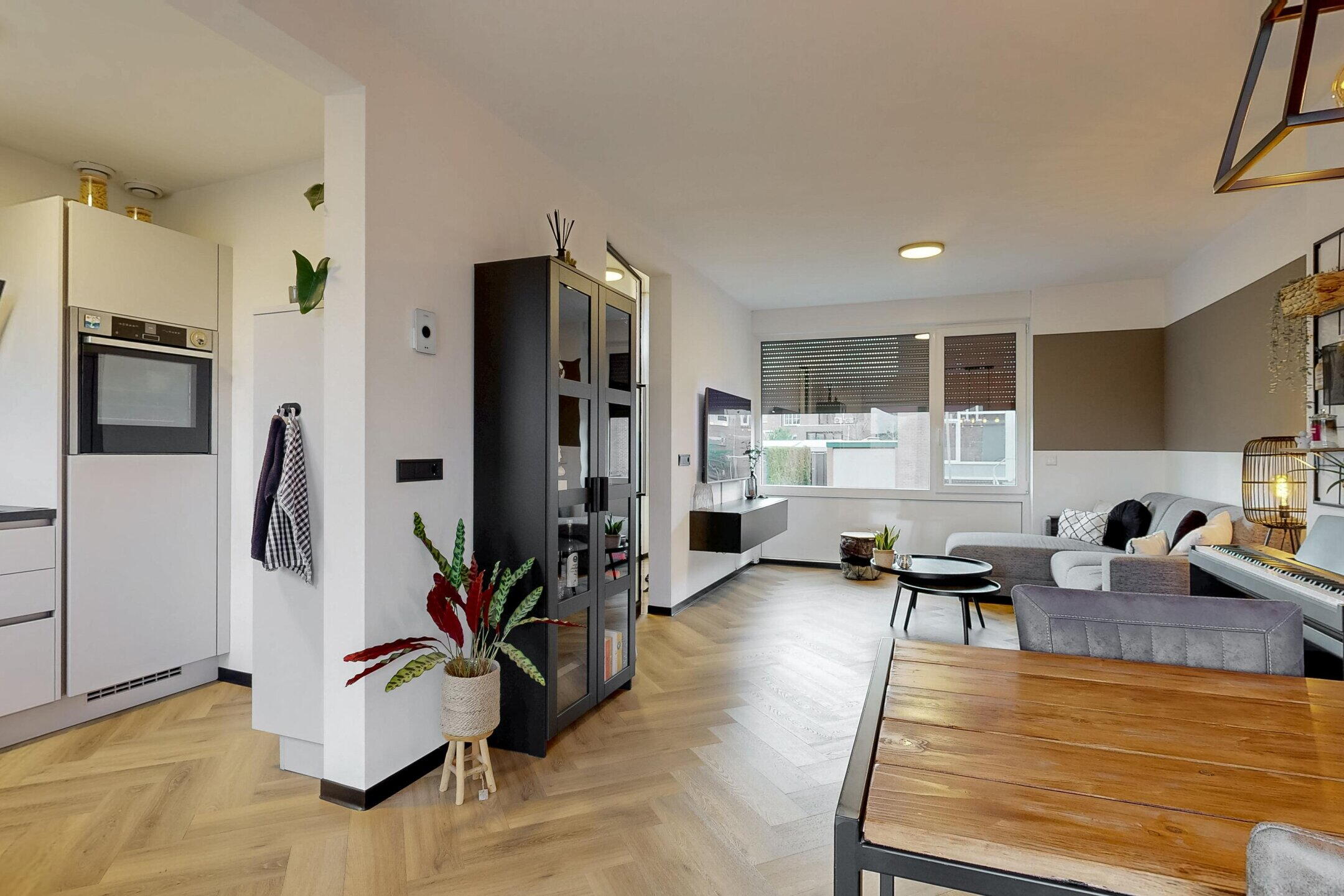 De doorzon woonkamer is ca. 24 m² en in 2021 voorzien van een vloerverwarming en een prachtige PVC vloer in visgraat motief. De half-open keuken (ca. 5 m²) is in hetzelfde jaar vervangen en is voorzien van o.a. een vierpits inductie kookplaat, design afzuigkap, inbouw combi-oven (gril/hetelucht), spoelbak, inbouwkoelkast en inbouwvaatwasmachine. Vanuit woonkamer heeft men via de kunststof schuifpui toegang tot de ruime achtertuin.