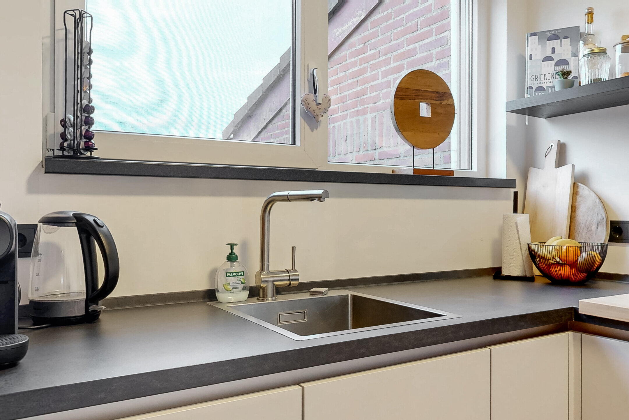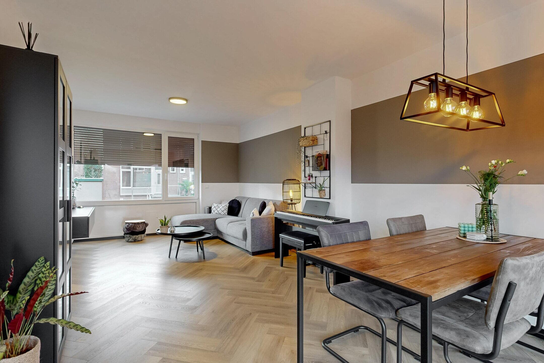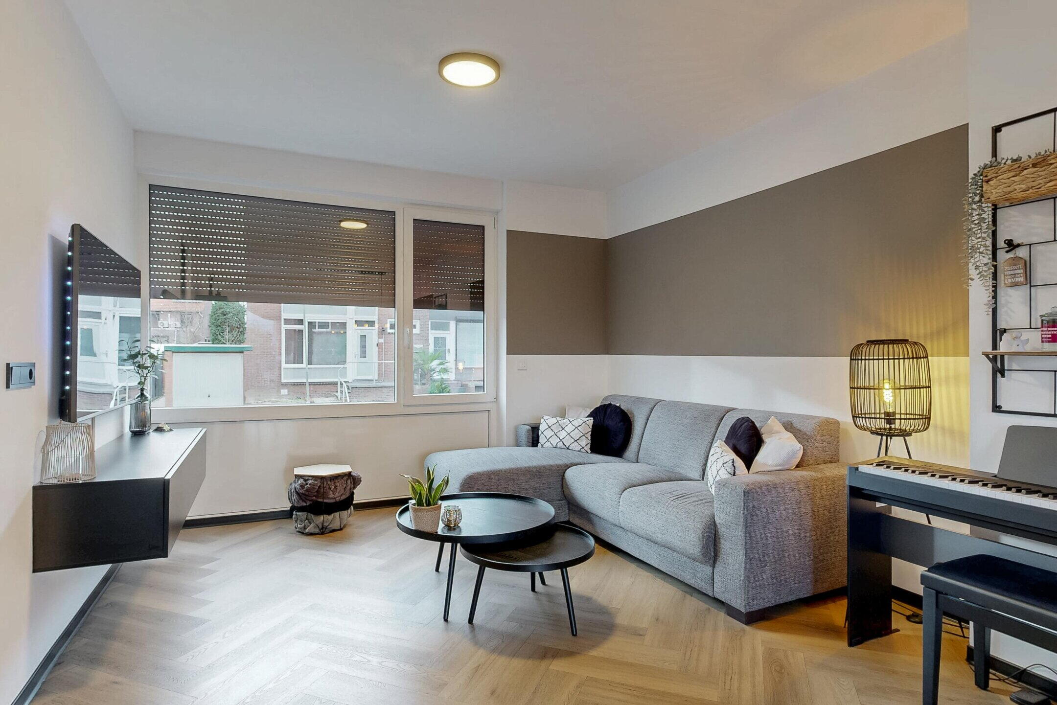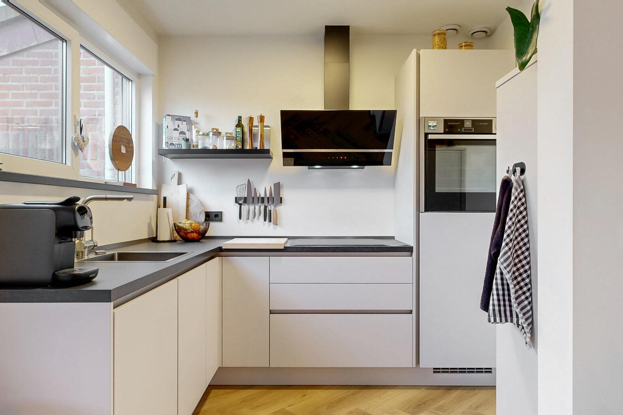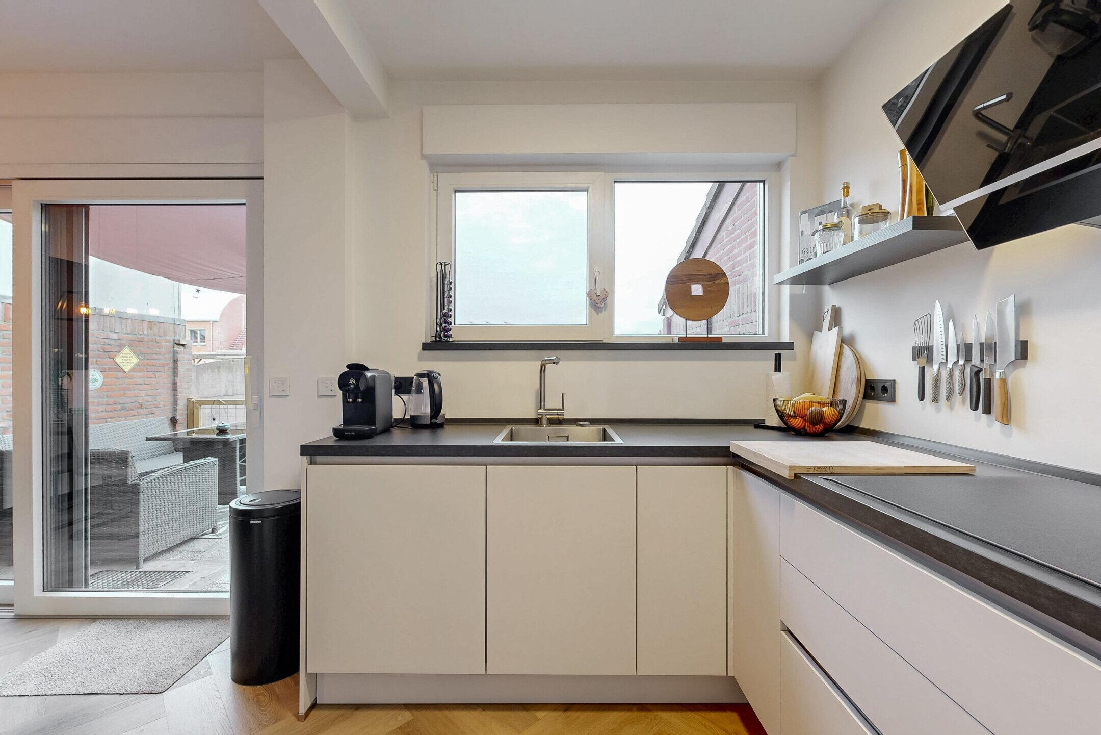 De doorzon woonkamer is ca. 24 m² en in 2021 voorzien van een vloerverwarming en een prachtige PVC vloer in visgraat motief. De half-open keuken (ca. 5 m²) is in hetzelfde jaar vervangen en is voorzien van o.a. een vierpits inductie kookplaat, design afzuigkap, inbouw combi-oven (gril/hetelucht), spoelbak, inbouwkoelkast en inbouwvaatwasmachine. Vanuit woonkamer heeft men via de kunststof schuifpui toegang tot de ruime achtertuin.