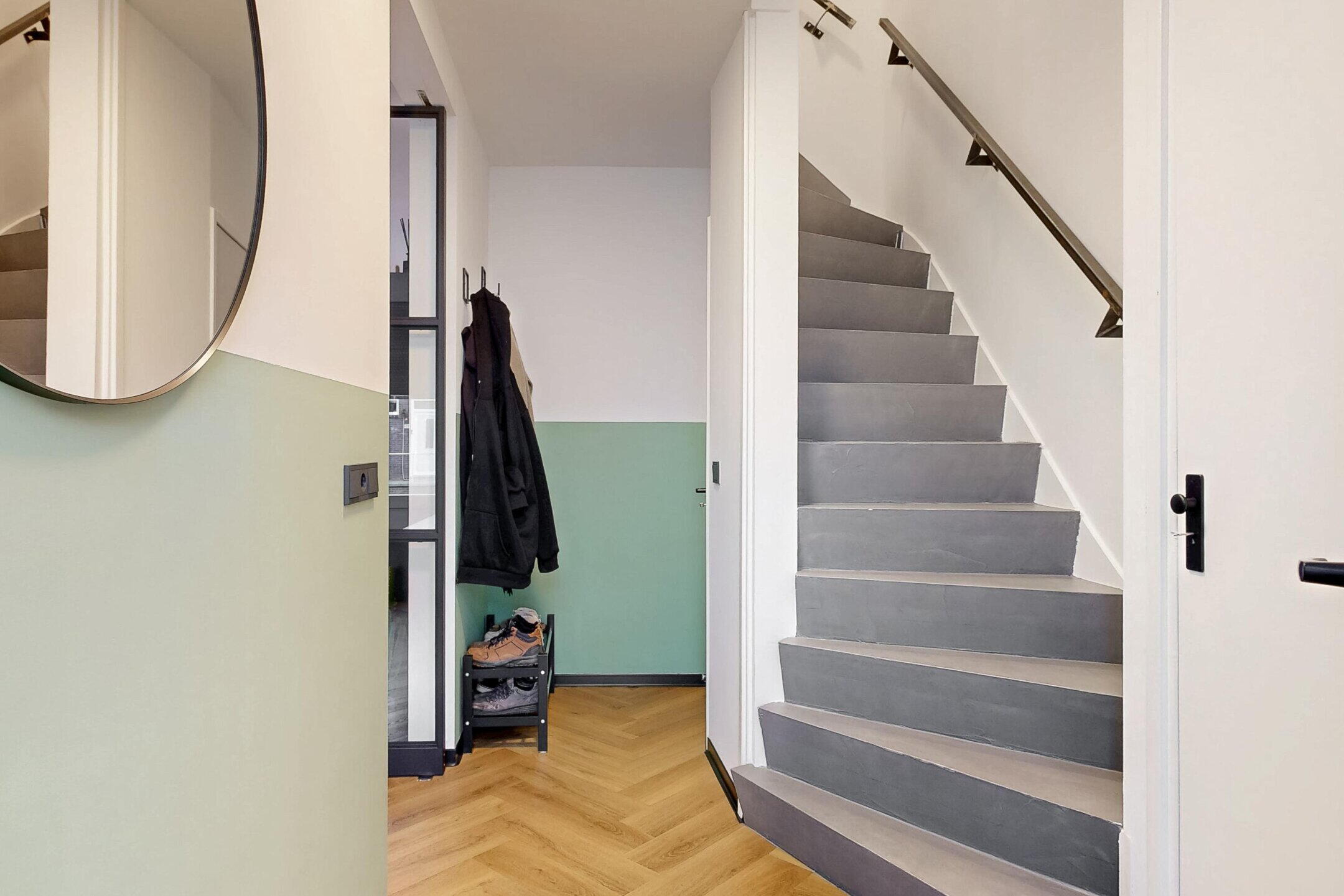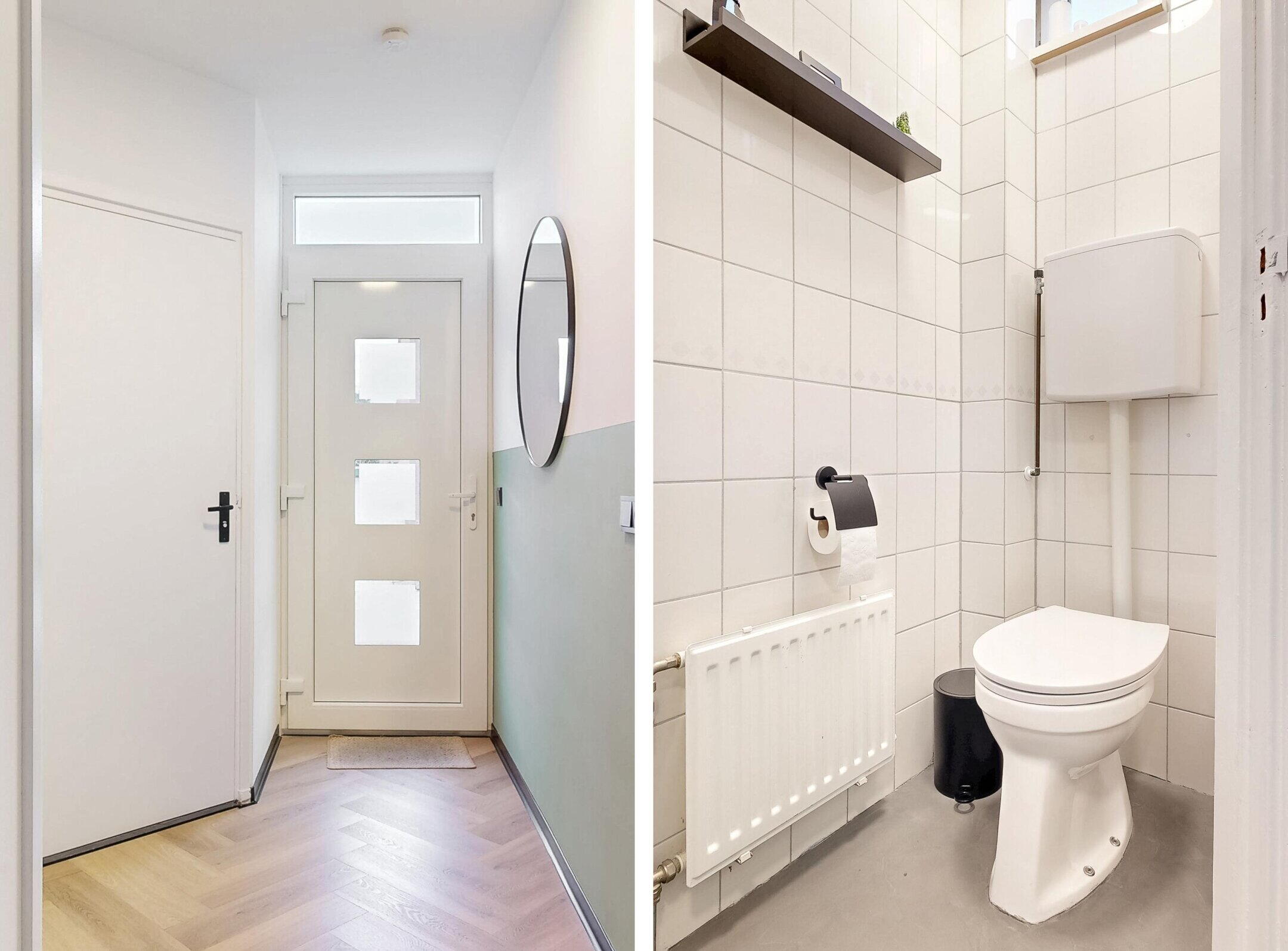 Begane grond: Via verharde voortuin en trapje naar entree. Hal met toegang tot de woonkamer, toilet, vaste trap naar 1e verdieping en separate deur/trap naar kelder en de meterkast. Het toilet is een van de weinige zaken die in 2021 niet is gemoderniseerd, maar nog prima functioneert. De meterkast is voorzien van een moderne groepenkast.