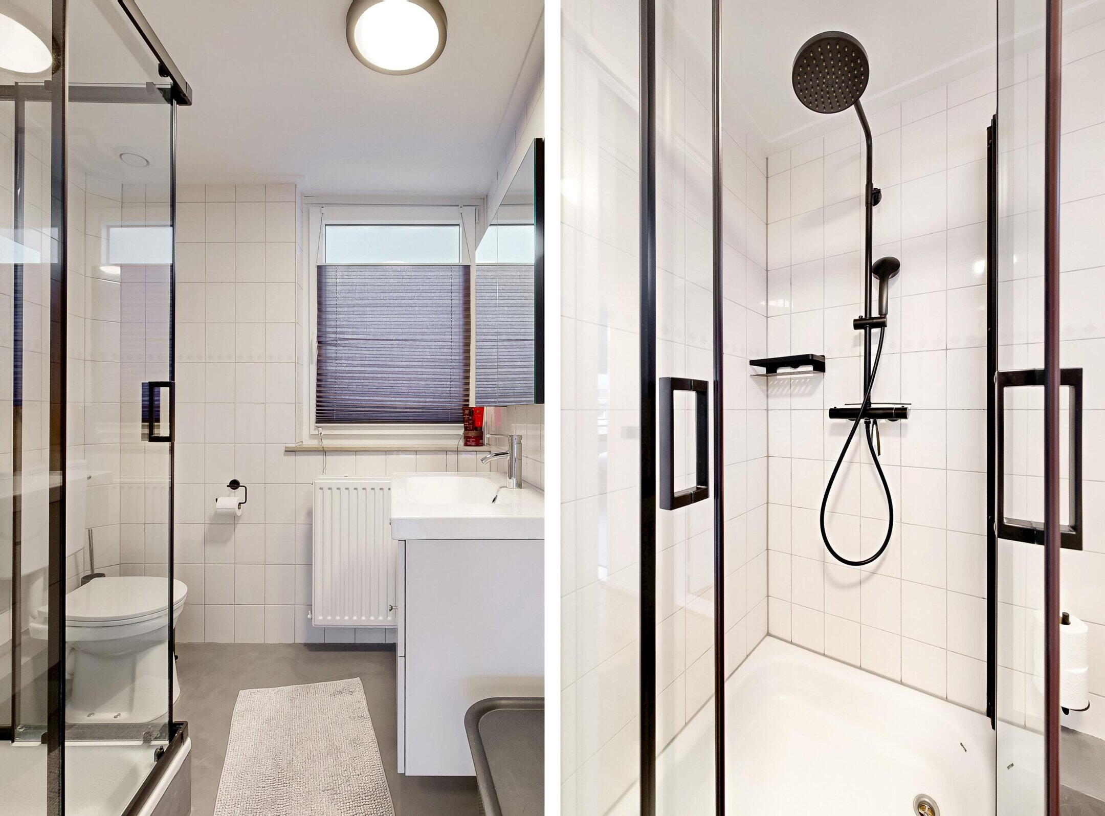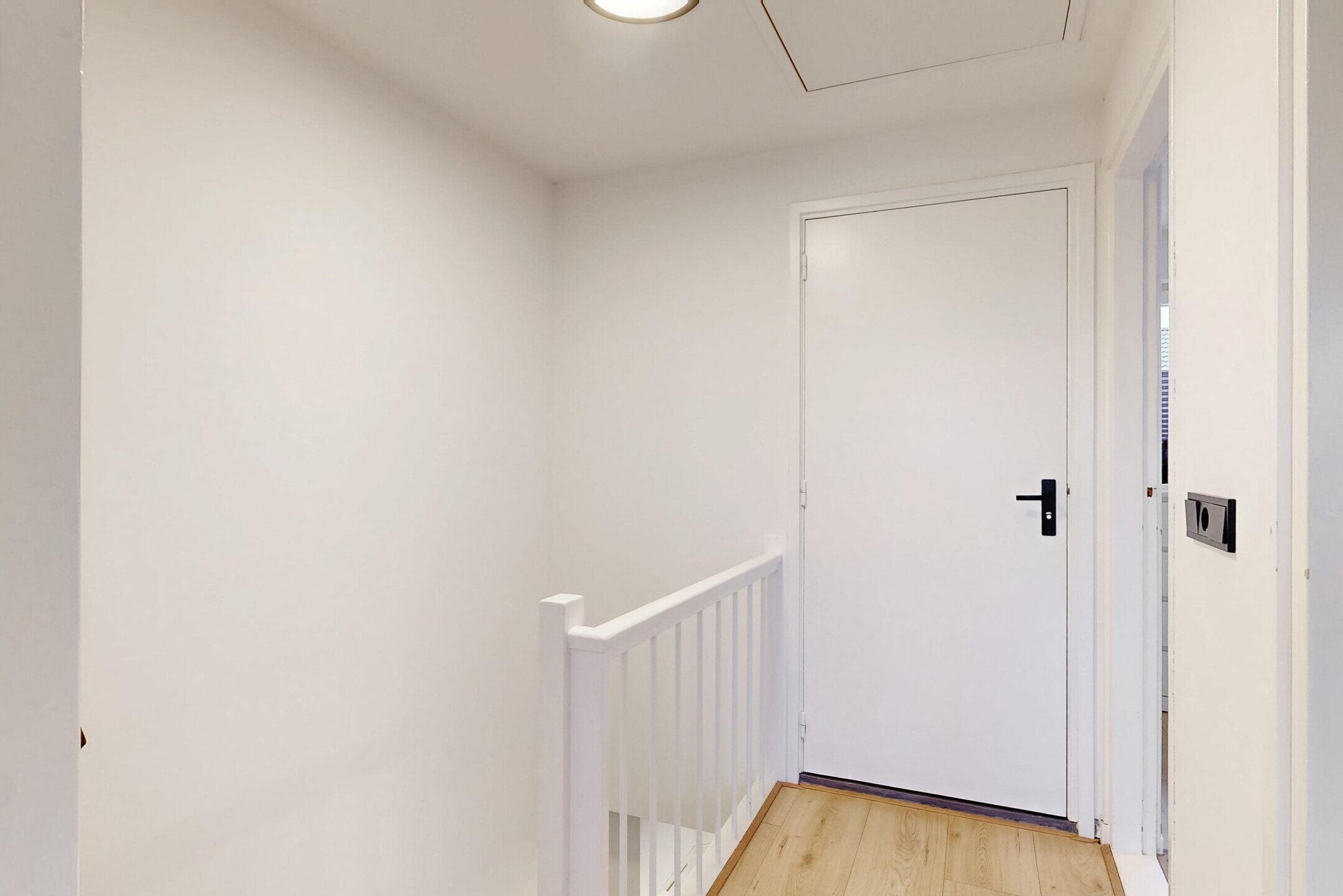 1e Verdieping: Overloop met laminaatvloer en toegang tot de drie slaapkamers en badkamer. De slaapakamer aan de voorzijde is ca. 11 m². De grootste slaapkamer ligt aan de achterzijde en ca. 14 m² en dan is er nog een kleine slaapkamer van a. 4,5 m² naast gelegen. De geheel betegelde badkamer (ca. 4 m²) is in verhouding tot de rest van het afwerkniveau enigszins eenvoudig van opzet, maar is functioneel ingericht met een douche, 2e toilet en vaste wastafel.