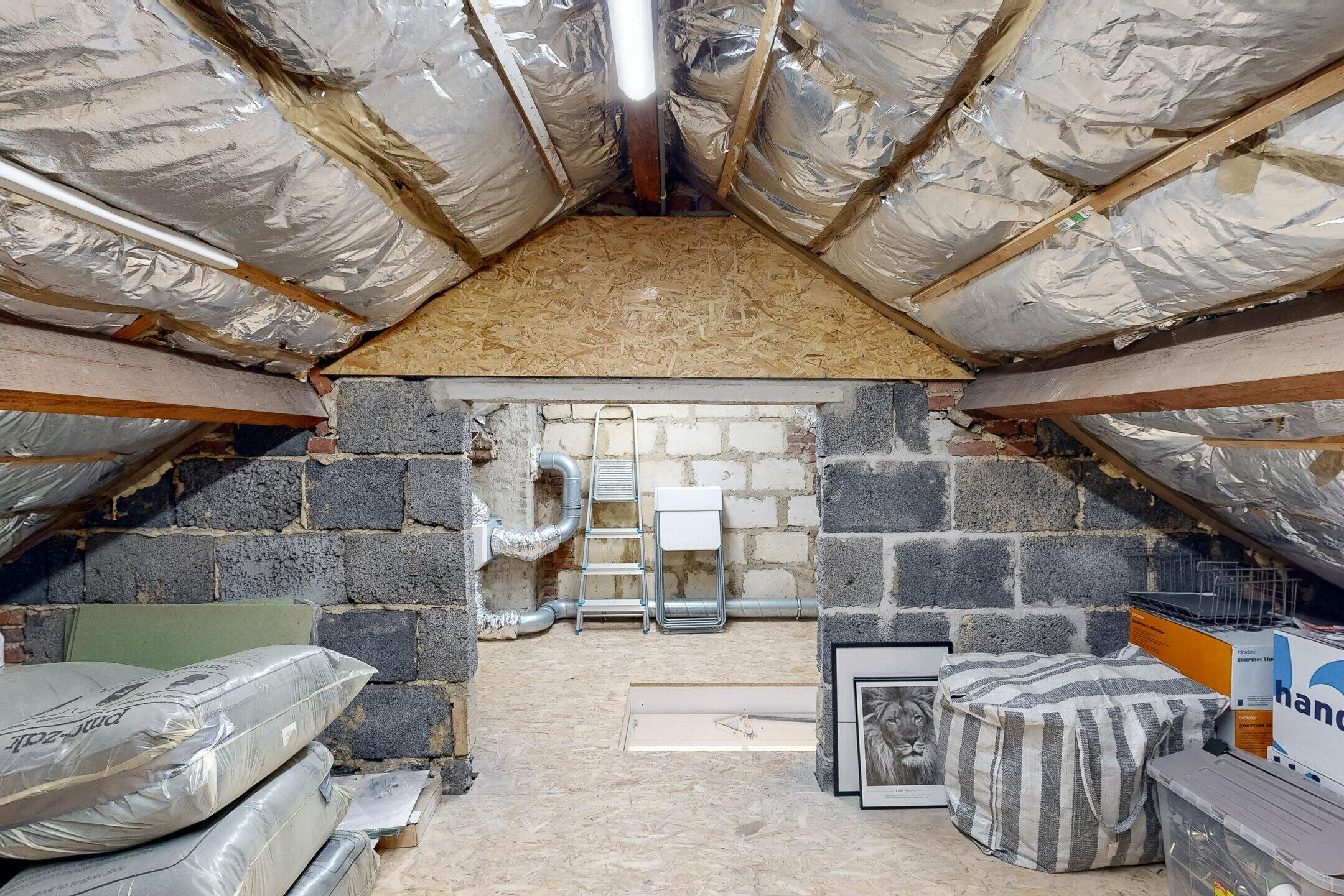 Zolder: Via nieuwe vlizotrap, is de ruime bergzolder (ca 39 m²) bereikbaar, waar meer dan voldoende opslagruimte is en een stahoogte in het midden van 2 meter. Theoretisch zou er dus via een dakkapel nog een 4e slaapkamer gecreëerd kunnen worden.