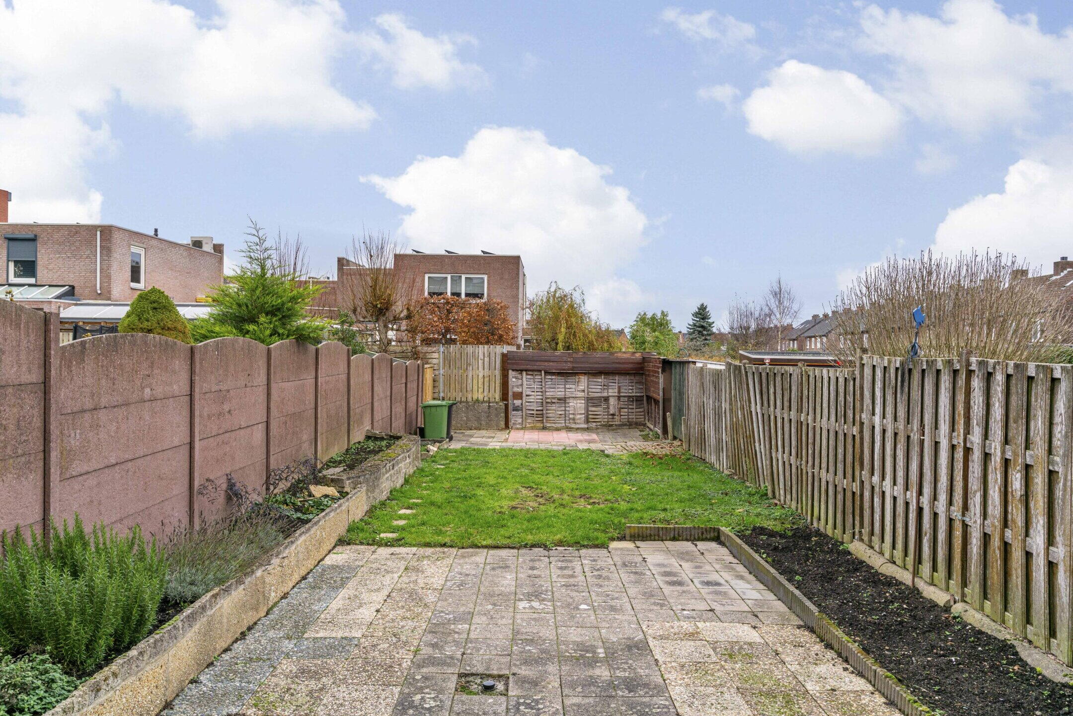 Tuin gelegen op het Oosten, ca. 26 meter diep met achteringang. Via de kunststof schuifpui komt men op een verhoogd terras waar men heerlijk kan genieten van de ochtend/middag zon. Via stenen trapje heeft men toegang tot de lager gelegen tuin die deels verhard en deels van gazon is voorzien. De tuin is volledig omsloten en via een poortje achterom bereikbaar.